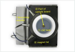 樣(yàng)品變溫 、固定部分組成 - 圓形液氮槽 - 樣(yàng)品固定板 - 溫度傳感器(qì) - 嵌入式(shì)加熱器(qì) - 磁體(tǐ)蓋 - 電纜(lǎn) | AMP磁體(tǐ)Kit俯視圖(tú) - 磁體(tǐ)移動馬(mǎ)達控制 - 圓形液氮槽 - 磁體(tǐ)蓋 - 電纜(lǎn) |